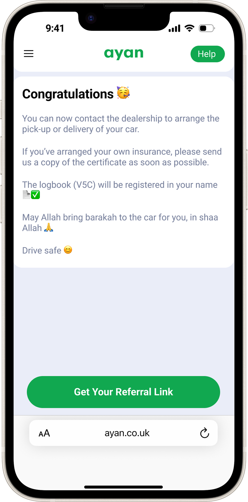 At the end of the contract, a separate Sale & Transfer agreement is signed to legally transfer the ownership of the vehicle to you, and if you have met your Ijara obligations, there is nothing left to pay